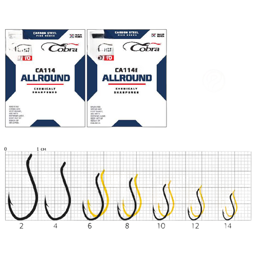 Allround - серия крючков, которая имеет идеальную форму округлого затылка, прямого лба, среднего по размеру цевья и удлиненного жала с бородкой. Эти детали формыделают эти крючки универсальными в использовании. Особо актуально их использование при подборе крючка для ловли на незнакомом водоеме. Ими можно ловить практически на всех водоемах, со всеми типами насадок и по всем видам рыб. Главное правильно подобрать размер крючка под условия ловли и ожидаемую рыбу.Представленный в серии широкий размерный ряд позволит осуществить этот процесс без проблем.
